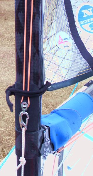 Pour fixer cette poulie, on l'attache sur l'élastique de tension de drisse, en utilisant un mousqueton pour pouvoir détacher le système lorsque l'on va ranger le mat en séparant la tête du bas de mat.